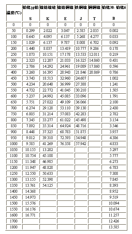 溫度(℃) 鉑銠10鉑 鎳鉻鎳硅 鎳鉻銅鎳 鐵銅鎳 銅銅鎳 鉑銠30- 鉑銠6
