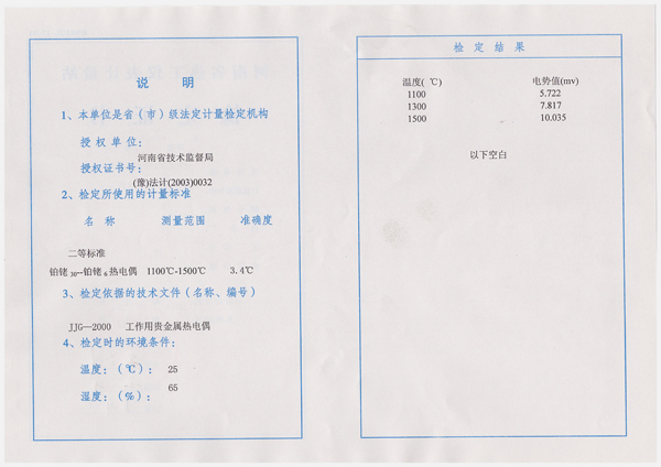 該熱電偶在室溫下熱電動勢極?。?5℃時為-2mV,50℃時為 3mV),故在測量時一般不用補償導線,可以忽略參考端溫度變化的影響。它的長期使用溫度為 1600℃,短期使用溫度為 1800℃。鉑銠 6 合金的熔點為 1820℃,限制其使用溫度上限。雙鉑銠熱電偶的電動勢率較小,因此,需配備靈敏度較高的顯示儀表。