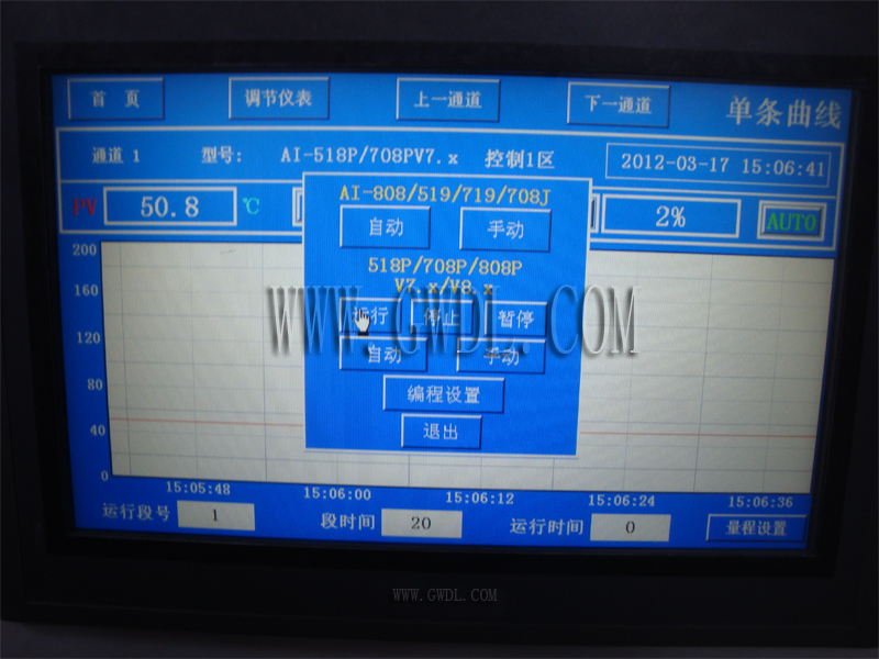 實時狀態(tài)顯示 | 運行曲線名稱、運行段號、段時間、段運行時間、數(shù)字溫度、實時曲線、功率輸出百分百 |